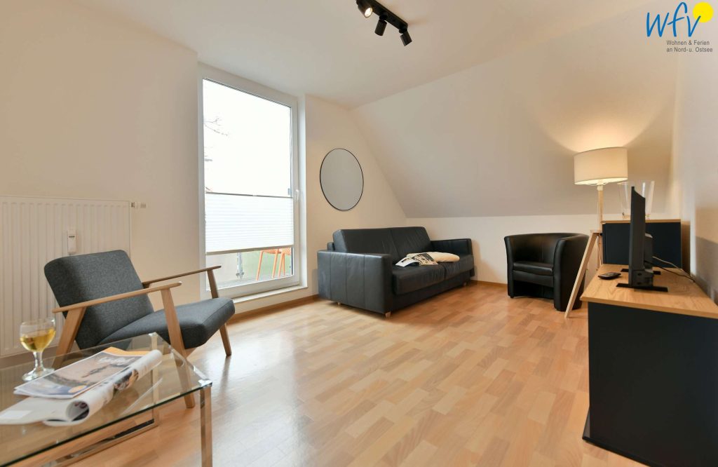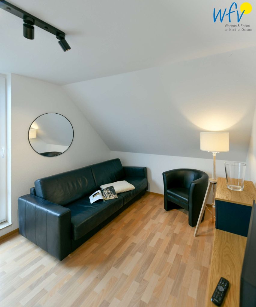 Herrlich relaxen können Sie auch im gemütlichen Wohnzimmer der Ferienwohnung, das u.a. mit einer Couch und einem TV eingerichtet ist.