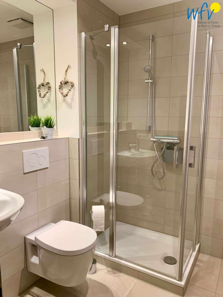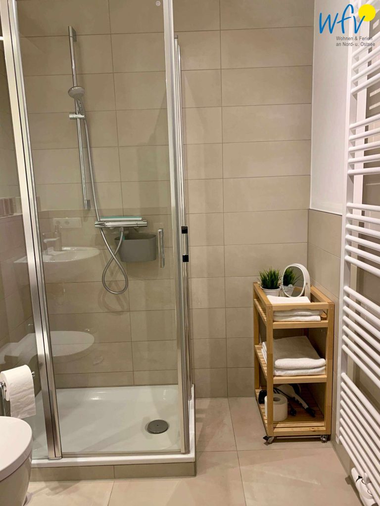 Für gehobenen Wohnkomfort sorgt auch die Ausstattung des modernen Badezimmers - u.a. eine Glas-Dusche, ein großer Wandspiegel und eine Handtuchheizung.