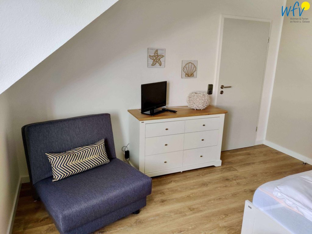 In dem oberen Bereich der Ferienwohnung auf Wangerooge erwartet Sie ein separates Schlafzimmer, das mit einem komfortablen Doppelbett (2 x 90 x 200), einem geräumigen Kleiderschrank, einer Kommode mit TV und einem kleinen Schreibtisch ausgestattet ist. Ein ausziehbarer Schlafsessel (80 x 200) bietet eine weitere Schlafmöglichkeit (für Kinder). Durch die großen Fenster und den schönen Blick ins Grüne werden Sie bereits beim Aufstehen entspannt in den neuen Urlaubstag starten!