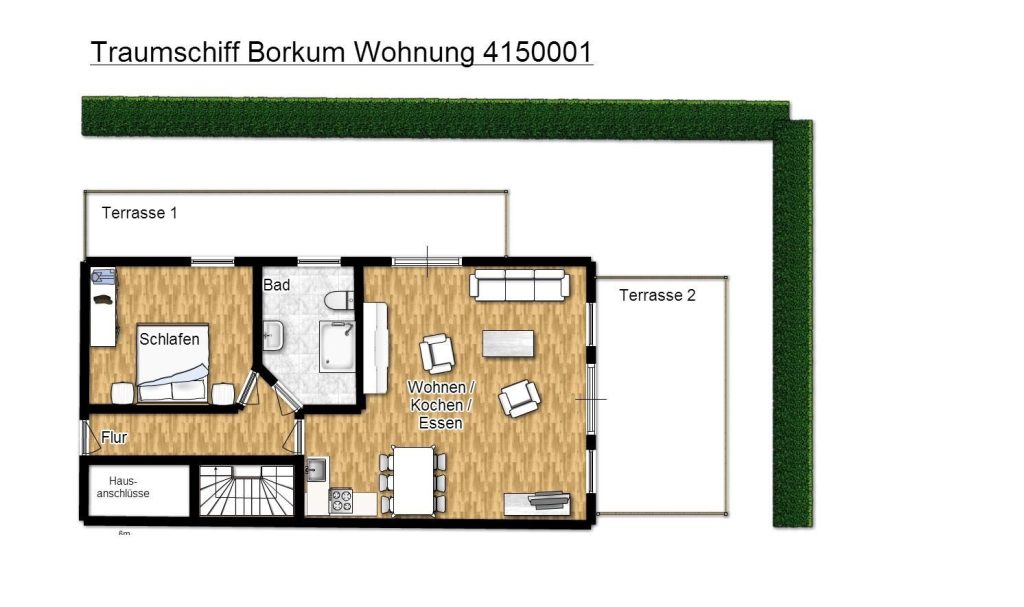 Unsere Ferienwohnung 1 im "Traumschiff Borkum" ist 50 m² groß und verfügt über ein helles Wohn- & Esszimmer mit einer offenen Wohnküche.