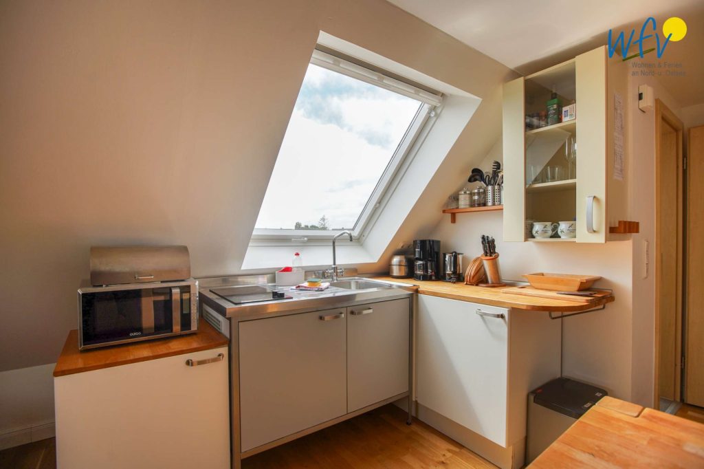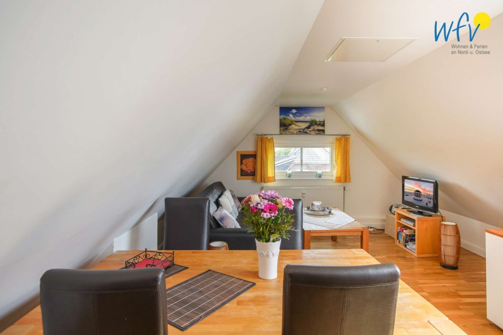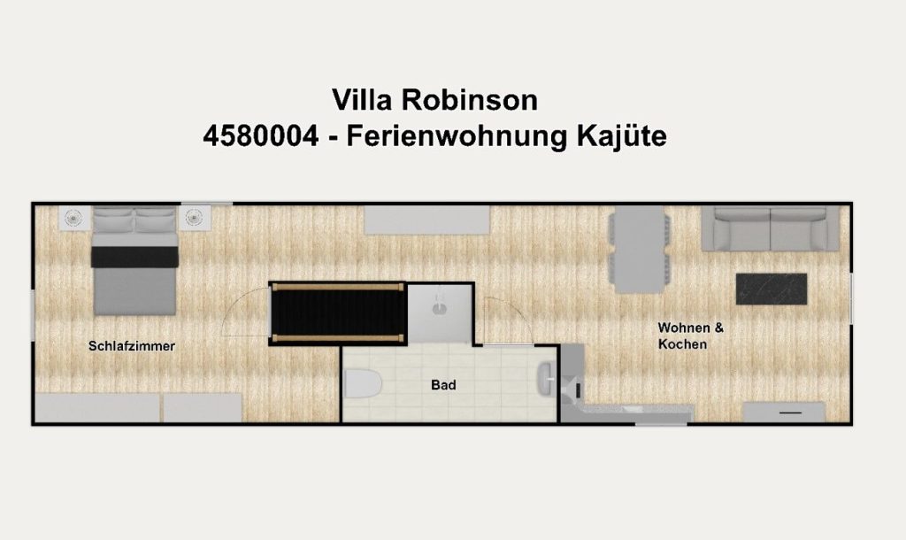 "Herzlich Willkommen" in unserer gemütlichen Ferienwohnung "Kajüte" auf Borkum! Es erwartet Sie ein Wohnraum mit integrierter Küche, Essplatz und Couchecke sowie einem Schlafbereich auf der gegenüberliegenden Seite des Raumes.